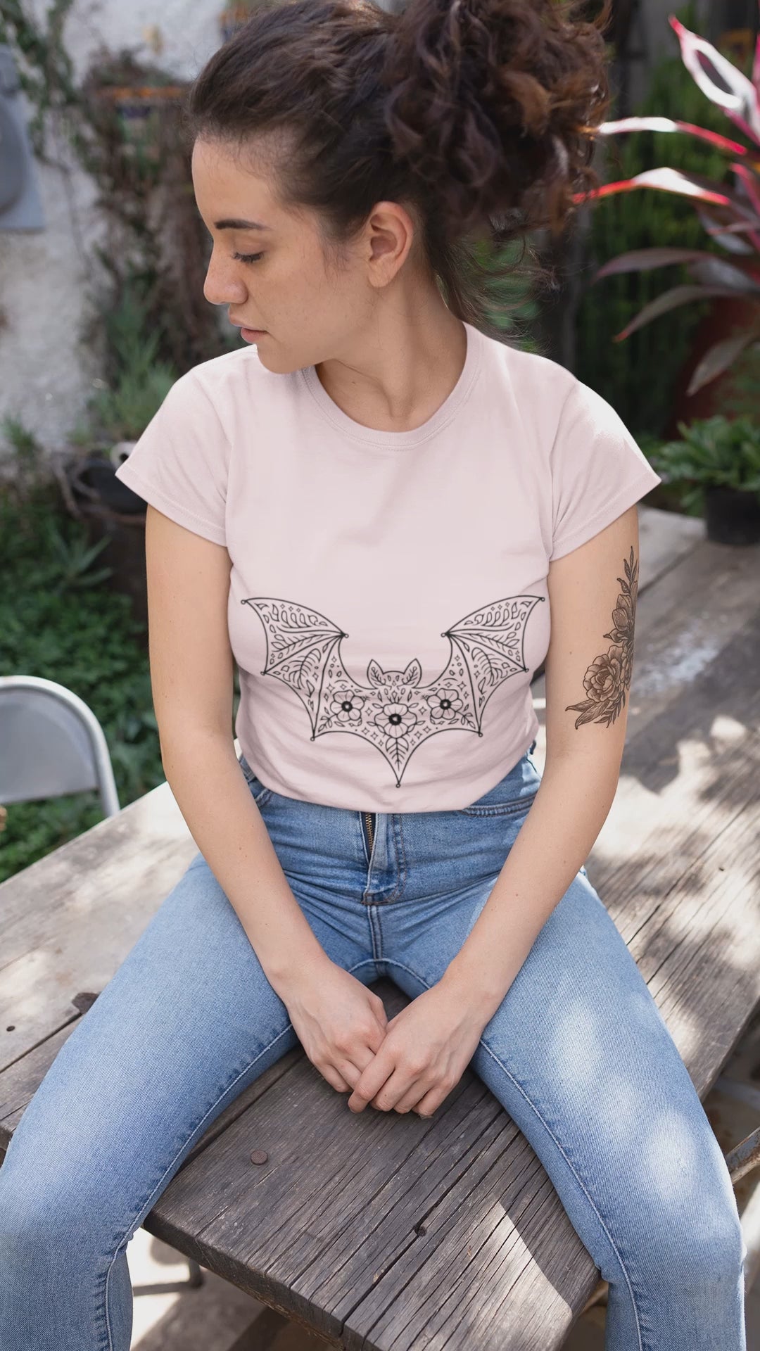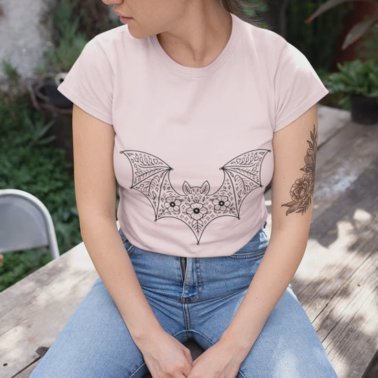 This Moonflower Gothic Bat T-Shirt blends nature and night into one striking piece of wearable art. The design features a symmetrical bat rendered in white line art against a solid black background. Its wings are filled with delicate floral and geometric patterns, while moonflowers bloom at the center of its body. Every detail, from the leaf-like lines to the subtle diamond star shapes, adds to the balance between elegance and edge.