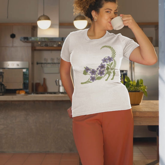 Violet Floral Cat T-Shirt for Cat Lovers and Plant Moms Cute Botanical Cat Lover Gift Cottagecore Garden Aesthetic Tee