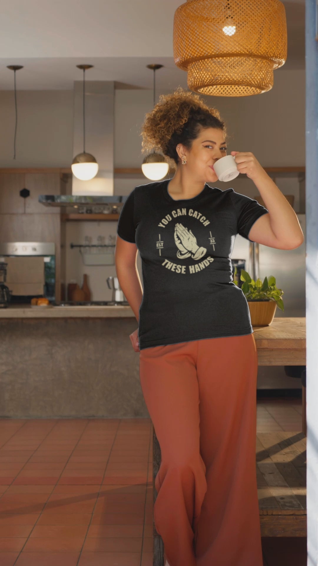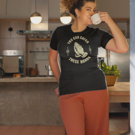 This funny Christian t-shirt puts a playful twist on the classic “catch these hands” phrase—reimagined with praying hands and the iconic year 33. It’s the perfect blend of faith, humor, and bold attitude, making it a great conversation starter wherever you go.