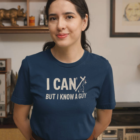 This “I Can’t But I Know a Guy” Christian T-Shirt brings faith and humor together in a bold vintage design. The large distressed text features the word “I CAN’T,” with the T shaped as a cross being carried by a silhouette of Jesus wearing the crown of thorns. It’s a clever, heartfelt nod to the message that even when we can’t, He can.