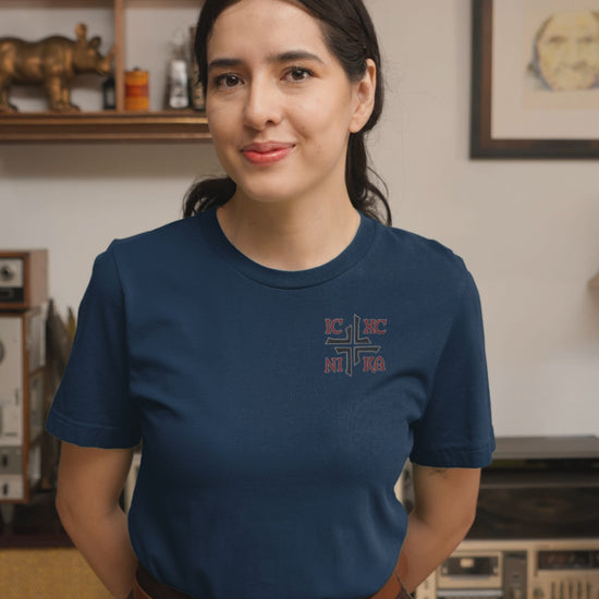 IC XC NIKA Jesus Christ Conquers Asymmetric Cross Emblem Embroidered T-Shirt