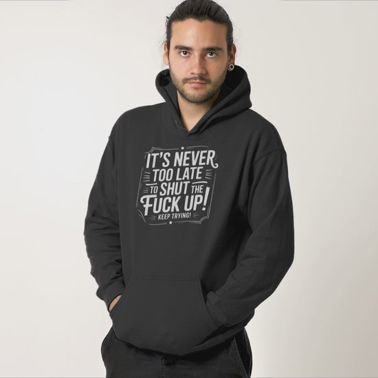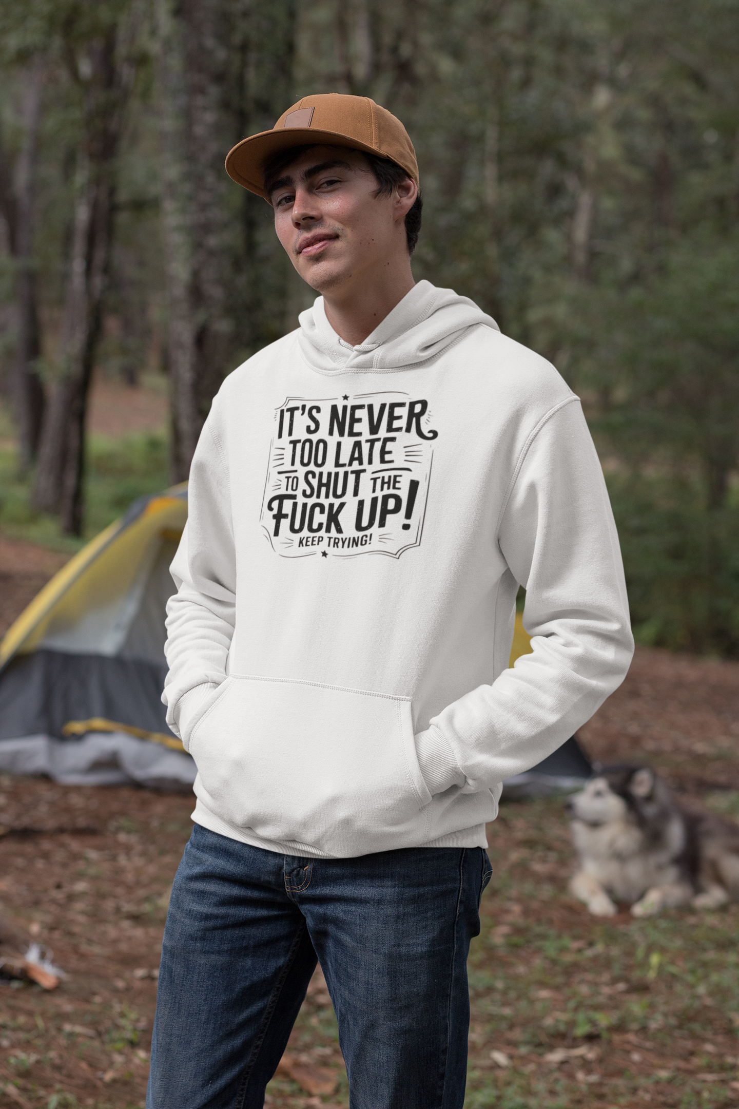 Turn your sarcasm into a statement with the It’s Never Too Late To Shut The F** Up!* hoodie, a perfect blend of humor, comfort, and attitude. Designed in bold distressed typography, this piece lets your sense of humor do the talking (so you don’t have to).