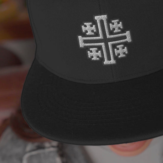 A clean, bold statement of faith, this flat embroidered snapback features the timeless Jerusalem Cross, stitched in custom deep red and white thread for a look that’s sharp yet reverent. Designed for those who wear their faith with quiet confidence and strength.