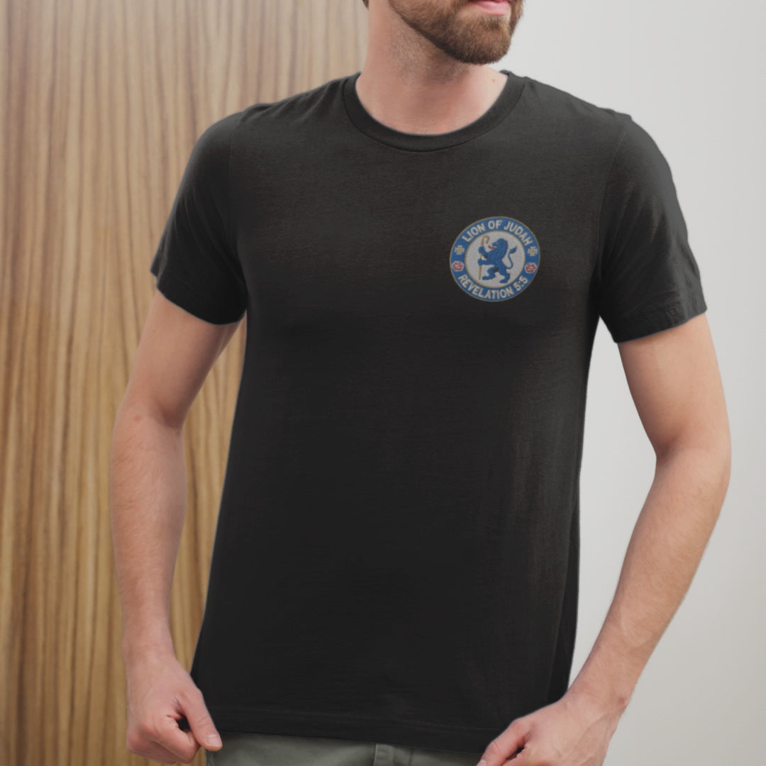 This embroidered Lion of Judah T-shirt brings bold scripture symbolism together with classic sports-team design. The blue lion crest, gold lettering, and Revelation 5:5 text create a powerful look that feels like a faith-based team badge. Whether you love the Bible, soccer, football, or simply strong Christian iconography, this tee blends it all into one standout piece.