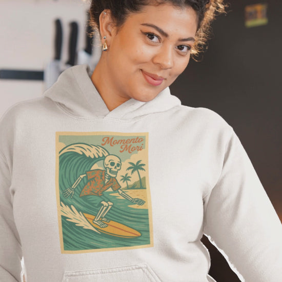 Ride the line between sunshine and shadows with this Momento Mori Surfing hoodie. A skeleton in a Hawaiian shirt glides down a towering turquoise wave, framed in the timeless warmth of a retro travel poster. It’s playful, bold, and just eerie enough to make beach days even better.