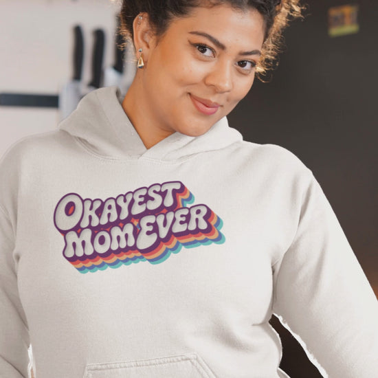 Stay cozy and clever with the Okayest Mom Ever Hoodie, a nostalgic nod to the 70s that turns humor into comfort. The bold white text is paired with a vibrant rainbow shadow made of layered purple, red, orange, yellow, green, and blue tones, creating a colorful retro look that moms will love.