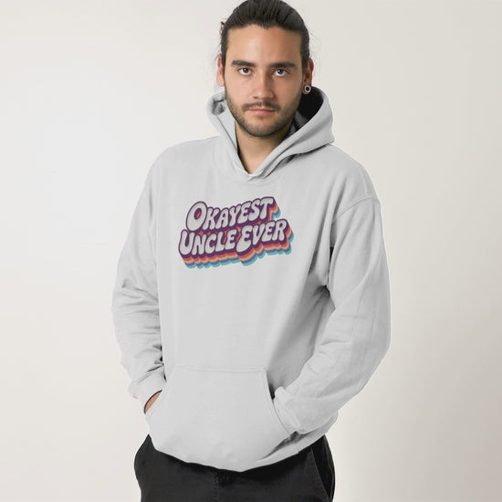 Bring some humor and warmth with the Okayest Uncle Ever Hoodie, a retro throwback for every uncle who keeps the family laughs coming. The bold white lettering with a rainbow shadow of purple, red, orange, yellow, green, and blue channels that groovy 70s vibe while keeping things lighthearted and fun.