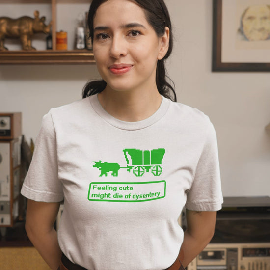 Feelin’ cute, might not make it across the river. This “Feeling Cute Might Die of Dysentery” T-shirt brings the dark humor of the Oregon Trail days back to life, pixel by pixel. The bright green 8-bit wagon design pays tribute to every gamer who grew up clicking their way through the 1900’s. Perfectly printed with Direct-to-Garment precision, it’s soft, breathable, and loaded with retro charm. Whether you survived dysentery or just miss floppy disks, this shirt gets a laugh every time.
