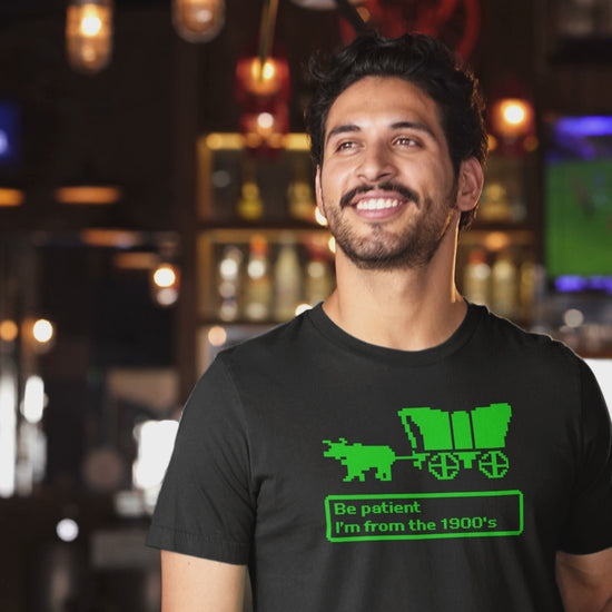 Remember when life ran at dial-up speed? This “Be Patient I’m From the 1900’s” T-shirt brings back the pixel-perfect charm of the classic Oregon Trail game. Printed in bright 8-bit green, it’s the perfect mix of retro humor and millennial nostalgia. Whether you grew up surviving dysentery or waiting for Windows 95 to load, this tee gets it. Soft, breathable, and Direct-to-Garment printed for that sharp vintage glow; perfect for old-school gamers and anyone proud to be from the 1900’s.
