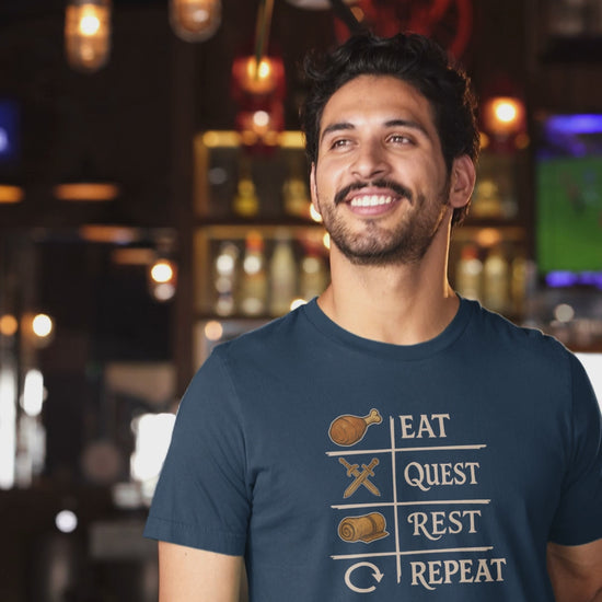 Whether you’re raiding dungeons or rolling dice around the table, this Eat Quest Rest Repeat tee sums up the gamer’s life perfectly. With vintage-style illustrations of a turkey drumstick, crossed swords, a bedroll, and a looping arrow, it captures the rhythm of every great campaign.