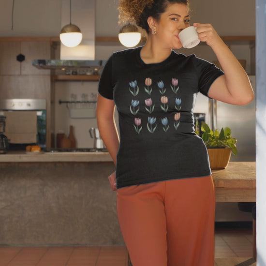 This tulip-grid T-shirt brings a soft botanical charm to your everyday wardrobe. Twelve hand-drawn tulips bloom in a tidy little garden of color, giving the design a calm, cottage-core appeal. Each flower feels like a character from a quiet meadow story, arranged in a grid that’s both artistic and soothing.