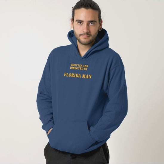 This “Written and Directed by Florida Man” hoodie blends pop culture parody with meme chaos, reimagining the iconic movie credit design for the internet age. A perfect fit for movie buffs, meme lords, and anyone who’s ever read a Florida Man headline and thought, “Yeah, that tracks.”