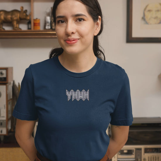 Wear the name above all names. This embroidered YHWH t-shirt features the sacred name of God in a bold angular monogram that merges faith with modern style. The navy and white contrast brings a sharp visual impact while keeping the message pure and reverent.